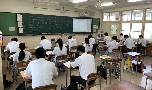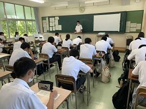(リモートでの開催の様子、2年生は総合学習室、1年生は各教室での参加)