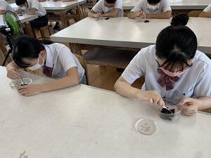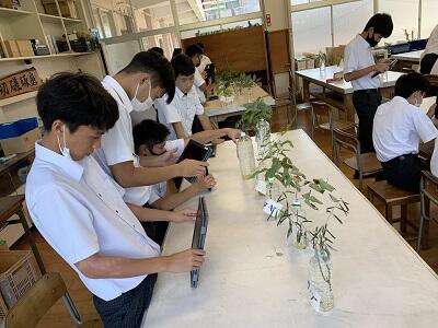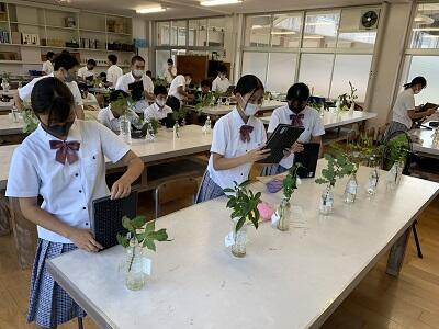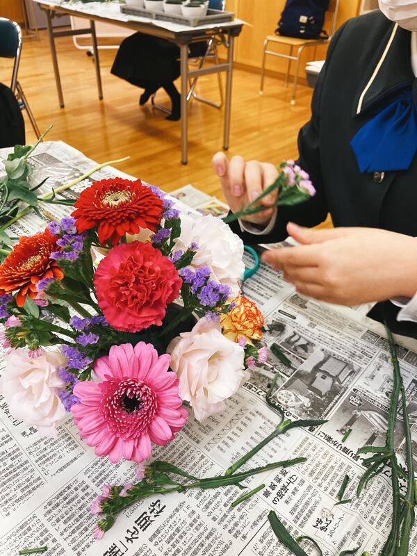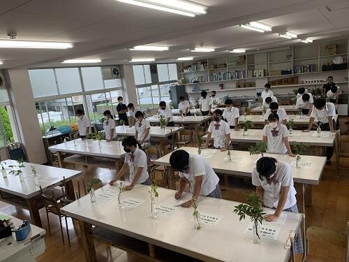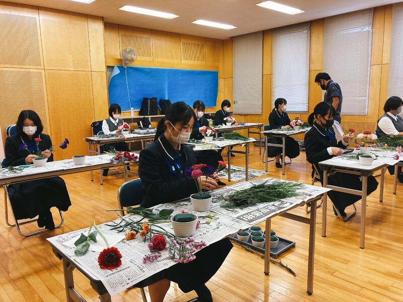 花に興味がある生徒8人(3年1人、2年4人、1年3人)は、年間を通してフラワーアレンジメントのいろんな技法を学びます。講習会に参加している生徒は、フラワーアレンジメント大会にも出場し、毎年上位成績をおさめています。