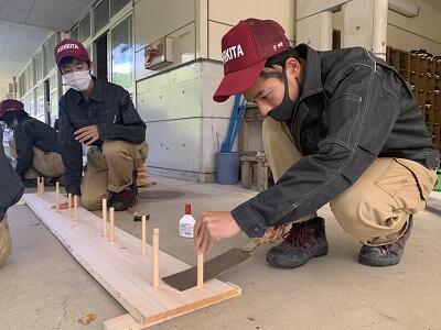 講師の先生方のご指導のもと、「わな」の柵を組み立てる生徒達。