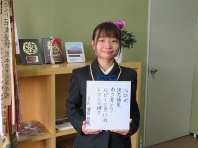 「おもいがけず立派な賞をいただき、びっくりしています。実習中に感じたことを短歌に詠みました。これからも短歌作りを楽しみながら続けていきたいと思います。」(3A 濵田 智恵)