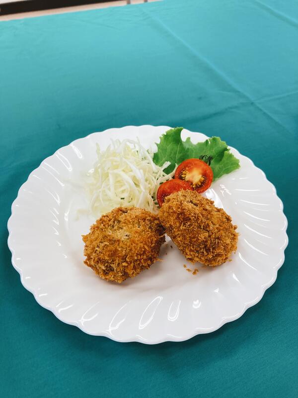 式典に出席されたご来賓の方に配付したお弁当は、食物部2年生がメニューの考案と試作を行った『鹿コロッケ』を今回の特製お弁当のメニューの一つとして、製造元である「道の駅あしきたでこぽん」の御協力のもと加えていただきました。