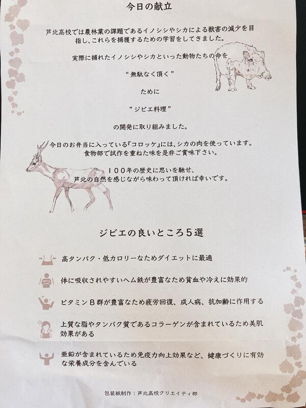 また、包装紙はクリエイティ部がデザインを考案し作成しました。裏面にはジビエに関する課題やジビエの栄養成分についても書いてあります。シカとイノシシのイラストも生徒が描きました!