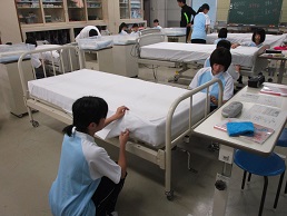 5月29日(火)3限目~4限目にかけて熊本県介護技術コンテストベッドメイキングの部出場に向けた予選会「第1回芦北高校介護技術コンテスト」を1年福祉科の生徒が行いました。