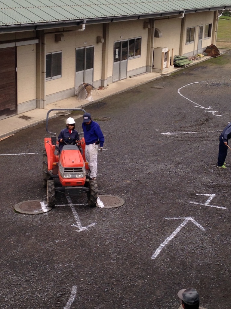 を行ないました。今回は耕運操作はせず、走行操作をマスターするためにひとりひとり順番に乗車しました。農場に白線を引いて、ギアの入れ方、アクセルの踏み込み方など直線コースとS字コースを設定して演習しました。