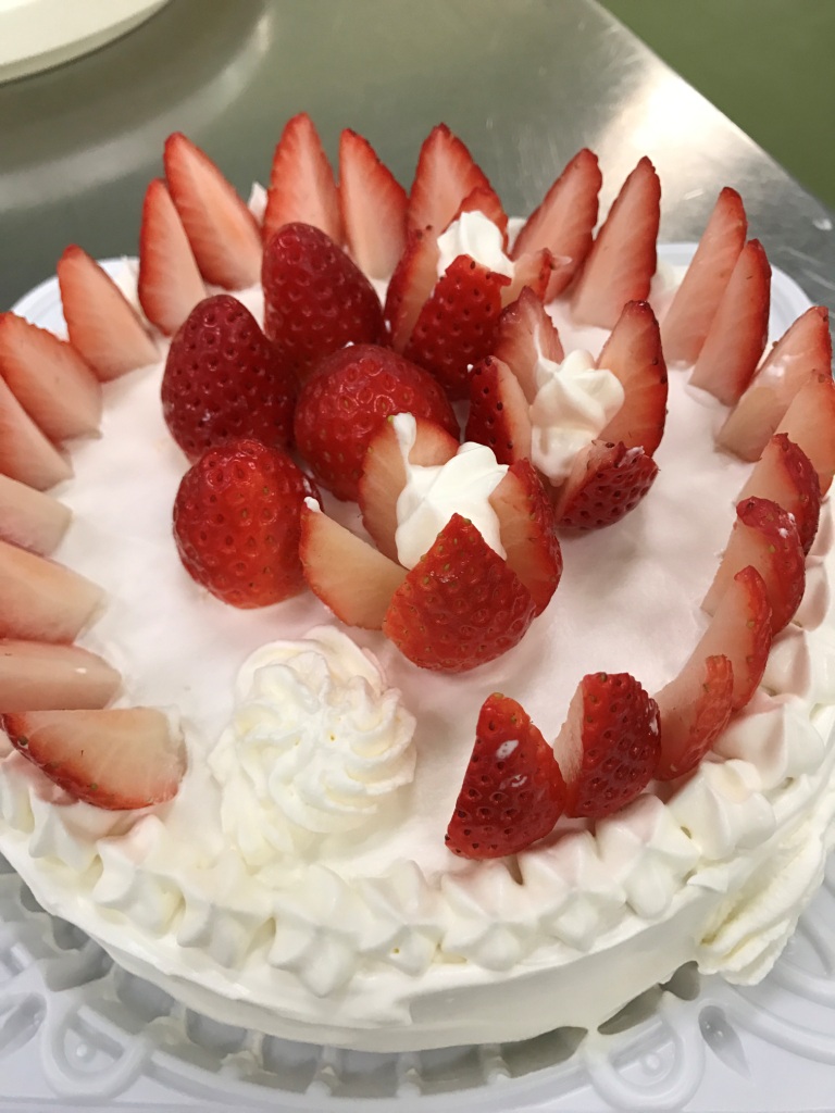 各班に分かれてそれぞれの感性でいろんなデザインのケーキが出来上がりました。イチゴを薄くスライスして全面に飾った班、苺が落ちるくらいたくさん飾った班、途中で生クリームを舐めちゃう班などなど、とても楽しそうでした。