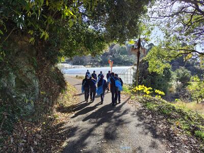 実習の始まりは、心地よい足音から。 青い収穫バッグを肩にかけ、みんなで果樹園へと向かいます。生い茂る木々のトンネルを抜けると、そこには黄金色に輝く宝物たちが待っています