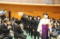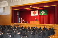 校長先生からは、本校の校訓である「敬愛(周りの人を敬い愛する心)」「勤勉(精神を集中して一心に勤める姿勢)」「創造(一から創りあげていく力)」を胸に刻むことが自身の基軸となりブレない力になる。夢を実現するには小さな歩みの積み重ねが大切である。予想しないことに不安がるのではなく、前向きにとらえる考えを持ってほしいといったことを式辞で述べられました。