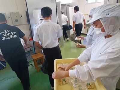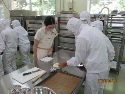 8月1日(木)芦北高校農業科食品実習棟で芦北郡・水俣市教科等研究会中学校理科部会の研修が行われました。研修に当たって、1年農業科の生徒たちが食品製造で学んだパン製造について、中学校の先生方と一緒に製造実習を行いました。参加された中学校の先生からの質問に対して、生徒たちは緊張しながらも、日ごろの実習で学んだことをしっかり伝えていました