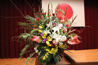 今回の式典では、フラワーアレンジメント全国大会に出場した3年農業科松本くんの作品を演台に飾りました。