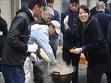 右下の写真は、食物部による紹介の1シーンで、「キュウリを30秒で何枚切れるか」という競争を新入生と先生に参加してもらって行ったものです。