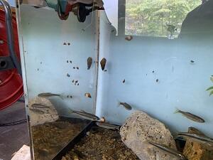 課題研究のホタル班は、学校横の乙千屋川の環境保全活動を行っています。昨年の7月豪雨で乙千屋川は、ホタルの餌となるカワニナが激減してしまっています。そこでカワニナを繁殖させているのですが、40匹でスタートした個体数は200匹近くまで増えてきました。このカワニナは川に放流予定です。