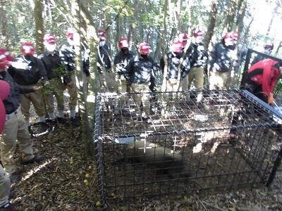 課題研究のハンター班は、学校の鏡山演習林内に箱罠と囲い罠を設置しています。今回は、さらにくくり罠(鳥獣が穴に足を入れると自動で足が縛られる罠)の設置を練習しました。今後、2年生がこの鳥獣被害対策の勉強を引き継いでいきます。3年生の中には、この罠の資格を取る生徒もいるそうです。すごいですね!!!。
