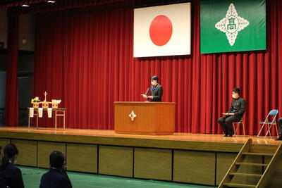 始業式(8月26日)は、コロナ感染症の拡大防止の観点から各クラスにおいてリモートで行われました。はじめに、新生徒会役員の任命式が行われ、旧生徒会役員から新生徒会役員の引き継ぎが行われました。新生徒会(会長1名、副会長2名)の挨拶では、今学期11月19日に予定されている創立100周年記念式典に向けての思いも述べられました。