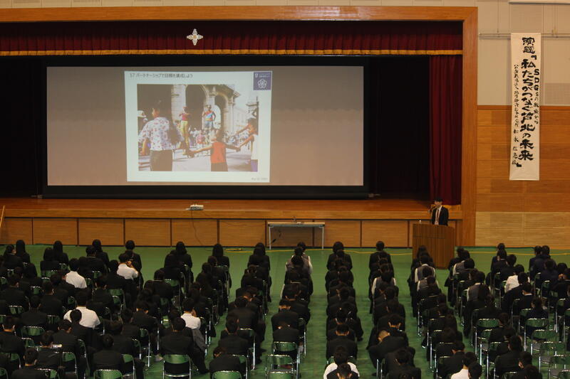 世界60か国をバックパッカーで巡られた際の写真をもとに、SDGs17の目標についてご説明なされ、自然災害のニュースなどを提示されながら、SDGsの大切さについてお話しいただきました。