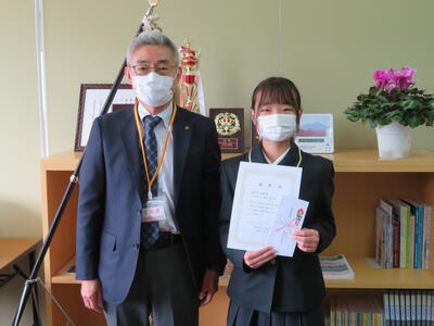 一般財団法人熊本公徳会の事務局長 甲斐壮一様が来校され、公徳文芸賞短歌の部で最優秀賞を受賞した3年農業科 濵田智恵さんに賞状・盾・記念品の授与が行われました