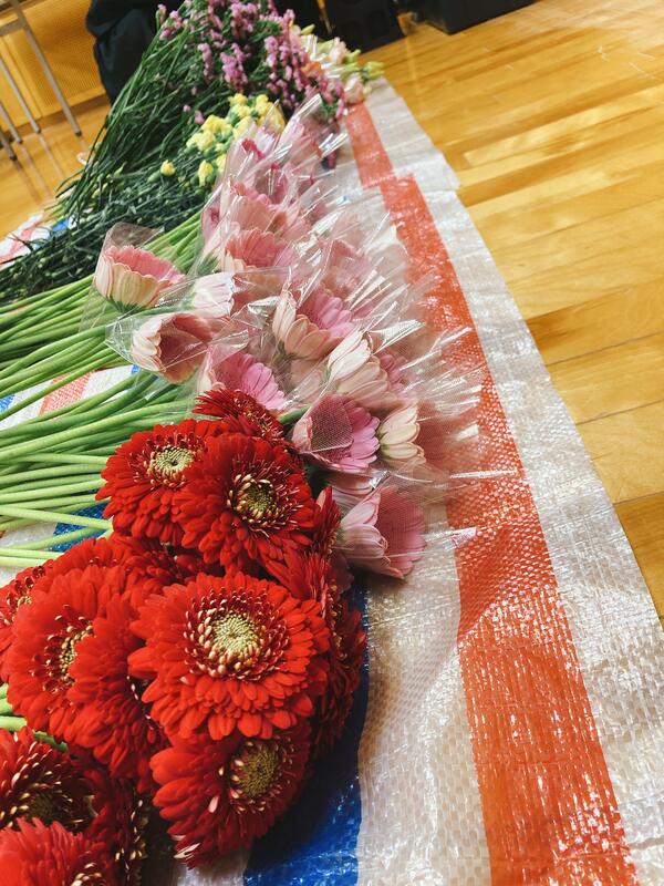 この8人の生徒は、11月19日(金)に行われた創立百周年記念式典の会場装飾を担当し、来賓席を中心にドーム型のアレンジメントを50個程制作しました