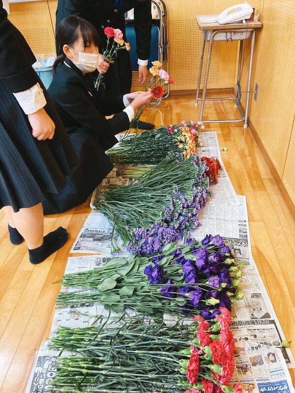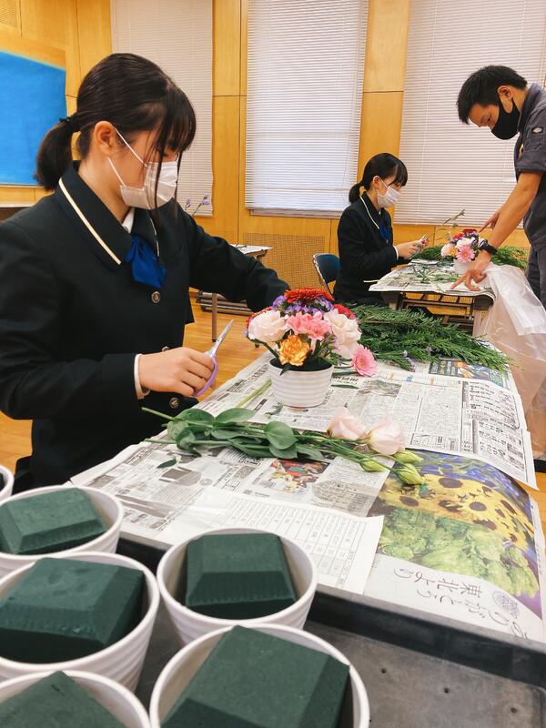 花に興味がある生徒8人(3年1人、2年4人、1年3人)は、年間を通してフラワーアレンジメントのいろんな技法を学びます。講習会に参加している生徒は、フラワーアレンジメント大会にも出場し、毎年上位成績をおさめています。