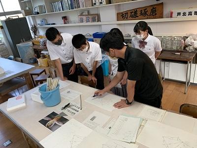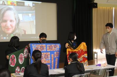 熊本学園大学の先生方から生徒達の発表をたたえるコメントと、各学科へ染め物のタペストリーを記念品としていただきました。