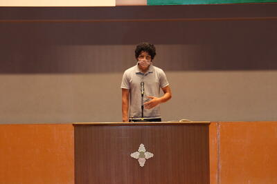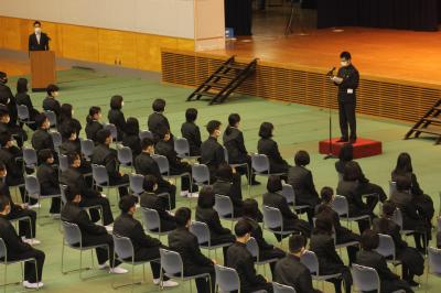 在校生総代として、生徒会長の濵田くんが送辞を述べました。在校生の代表として、各学科の先輩方が日夜努力してこられた姿に、在校生のみんなが感謝と尊敬と感銘を受けたことが述べられました。また、卒業生の希望ある飛翔を願うメッセージを向けられました。