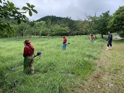 林業科1年生の初めての演習林実習が行われました。今日の実習は、下刈りです。刈り払い機とカマを使って草を刈っていきます。林業科では、このように自分たちで山の管理を行い、実際に間伐をして樹木の販売も行っているのです。