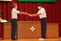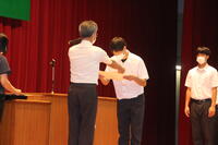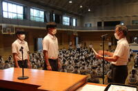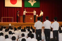 表彰式では、3年生の功績をたたえる様々な部門の表彰が、1、2年生が2階席から見守る中で行なわれました。