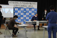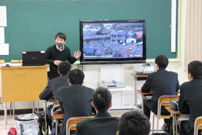 生徒達が利用する佐敷駅の隣に、「芦北町コミュニティーセンター」が建設されました。それに伴い、生徒達が佐敷駅から学校までの通学路を安全に通行できるよう、ICTで地図や写真を示しながら紹介されました。