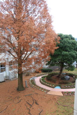 今日は久しぶりの雨、中庭のメタセコイヤも真っ赤に染まっています。