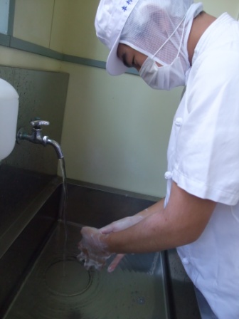 清潔な実習服を着て、髪の毛を1本も出さずに帽子を着用し、マスクも着用、爪ok、手洗いは掌・指の間もブラシで