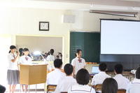 英語を学ぶためにやってきた学生さんを前に、用意してきたパワーポイントで各校・各地域の紹介をしました