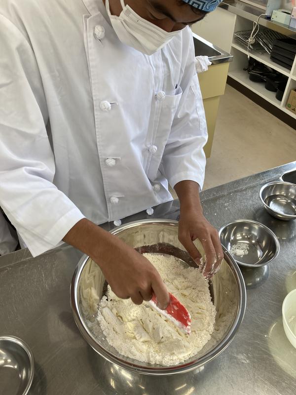 『パイ』の生地は固形のバターが溶けないように道具を使いながら素早く混合するのがコツです。
