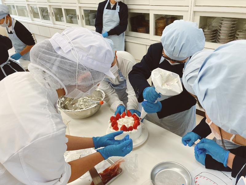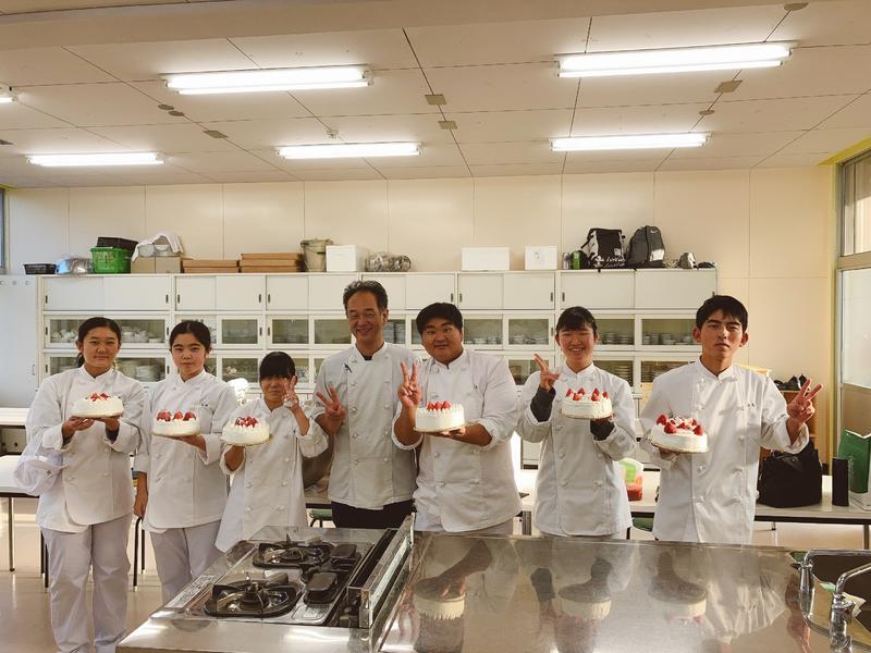 12月8日(火)に「芦北町芦北高校総合支援事業 レベルアップ講座」による佐敷小学校4年生との交流学習『デコレーションケーキ作り』が本校調理実習室で行なわれました。水俣市の洋菓子店『モンブランフジヤ』パティシエ 笹原和明様を講師にお迎えし、農業科3年課題研究食品班6人はケーキのデコレーション技術を教えていただきました。