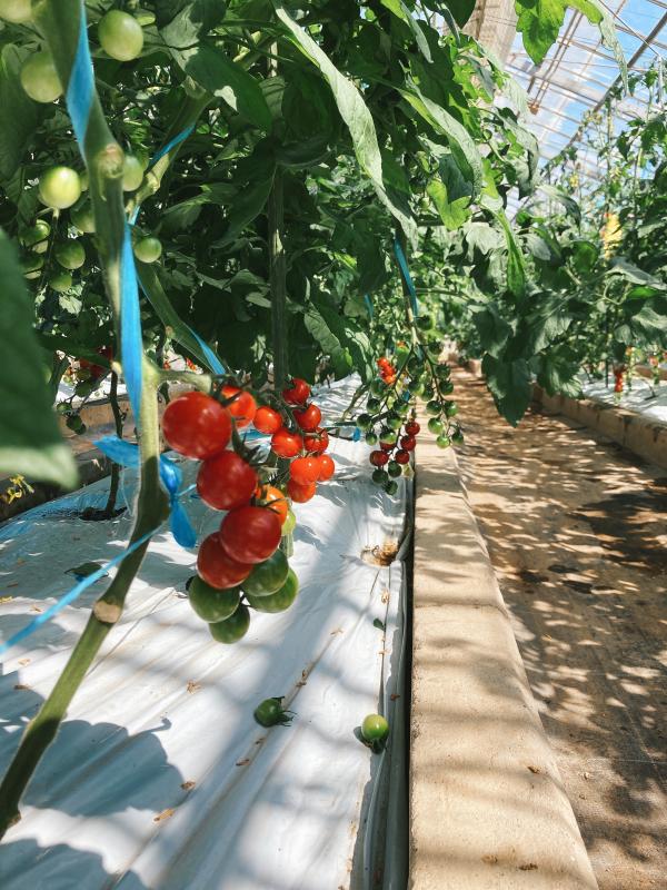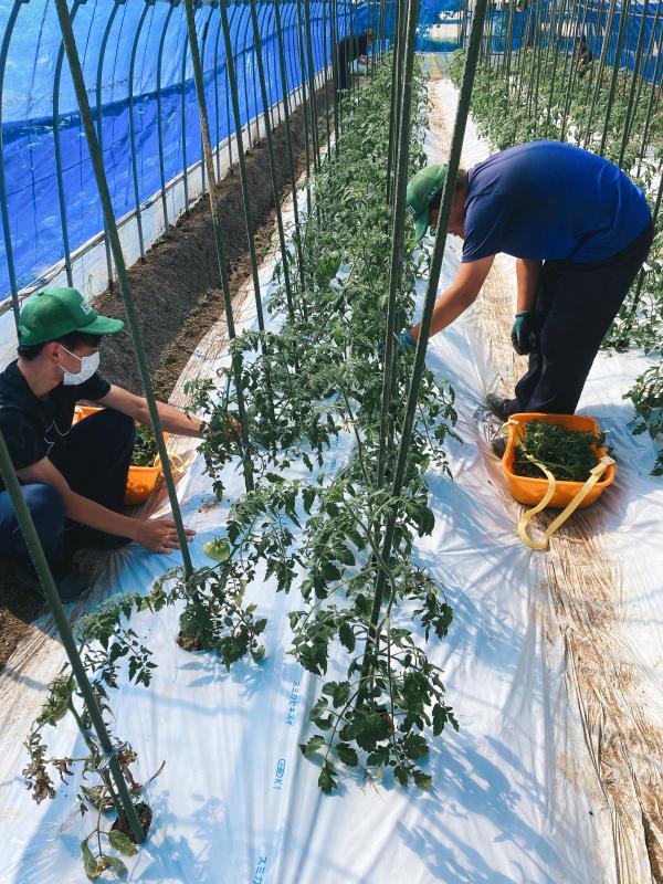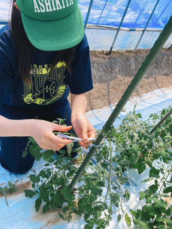 ハウスの中で「トマトの枝の誘引」を行っていました。