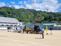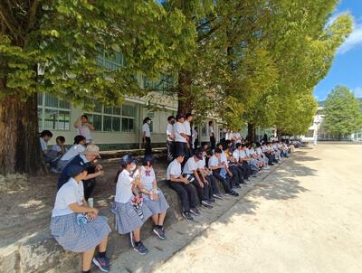 スタントマンが交通事故の状況を再現する交通安全教室が本校グラウンドで開かれました。強い日差しと34℃という気温の中だったので、日陰に入り帽子をかぶって水分補給用の水筒を片手に持ち全校生徒と芦北支援学校佐敷分教室の皆さんと参加しました。