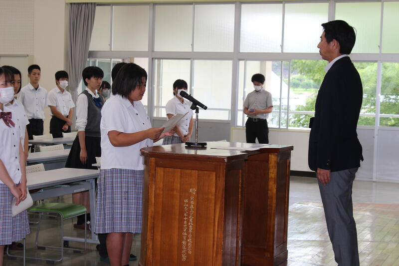 心地よい緊張感のなか、それぞれの学年代表が実習に臨むにあたって、誓いの言葉を述べました。それぞれが実習の課題と目標についてしっかりと述べ、充実した実習にすることを力強く誓いました。また、校長先生からも温かい励ましのお言葉をいただきました。最後に福祉科主任から、「実習を通して成長したみんなの姿を楽しみにしています」との言葉があり、全員が実習への決意を新たにしました。