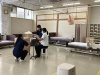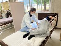 大堀先生は「動き出しは本人から。介護者がすべてやろうとせず、利用者様の自主性やできることを認めることが大切である」と話され、生徒は体位変換や車いす移乗の支援を実践しました。