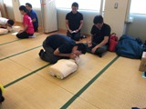 ①周囲の安全確認 ②意識の確認 ③協力者の依頼(救急車とAEDの手配) ④呼吸の確認 ⑤胸骨圧迫 ⑥気道確保・人工呼吸 の手順を手際よく行えるよう、グループになって練習しました。その後AEDの使用方法についても機器を使って手順を確認しました。
