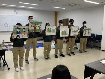 3年林業科の課題研究、木育・森育班は久しぶりとなる木育教室を芦北町のコミュニティーセンターで行いました。たくさんの親子連れに参加していただき、最初に森の役割を説明しました。