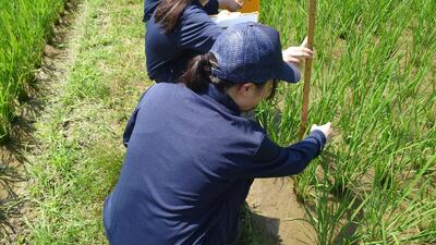 夏休みの当番実習でも、継続して調査を行ってます暑さに負けず、分げつしたイネの茎、葉を1本1本、丁寧に調査していました