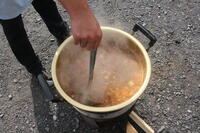 学校では、保護者が温かい豚汁で迎えてくれました。