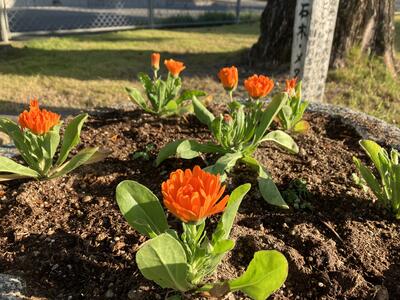 「キンセンカ」という名前です。太陽の光と同じくらいまぶしい黄色とオレンジが特徴です。