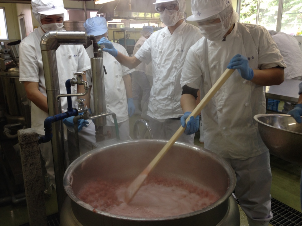農業科3年生「食品製造」の授業で、二重釜という大きな釜にイチゴとグラニュー糖、ペクチン、クエン酸を加えて煮詰め、