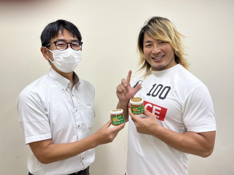 代表して棚橋 弘至(たなはし ひろし)選手に直接お礼を伝えることができ、本校特産のマーマレードをお渡ししました。