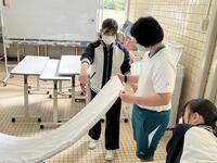 3年福祉科の生徒が日頃、学んでいる福祉について興味を持っていただくために、「ベッドメイキング」を佐敷分教室3年生に体験していただきました。