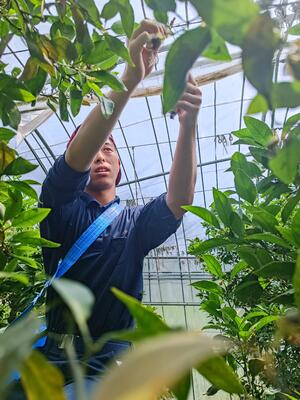 果樹専攻の生徒が摘果や枝吊り、玉吊りなどの実習を丁寧に行いました。玉吊りは、果実1玉1玉を確認しながらたくさんの果実を丁寧に紐で吊り、大切に仕上げました。収穫しているビニールハウスは、梅雨明け後には暑い中にビニールを剥ぎ、霜が降りる前にビニールを張ったりしました。慣れない実習もありましたが、みんなで協力し、最後まで不知火を大切に育てました。