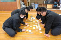 各クラスでチームを作り、トーナメント方式で百人一首の競技を行いました。みんなで協力して、楽しみながら授業に取り組みました。百人一首競技を通じて、古典に触れる楽しさを学ぶことができました。