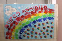 書道の作品や、各クラスオリジナルの壁新聞、色紙やイラストなどがならび、支援学校さんもレインボーカラーのオリジナル手形の展示を行なっていただきました。