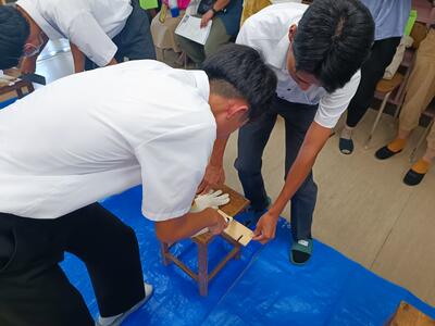 林業科の体験授業では、林業科ではどのようなことを学んでいくかという学科の説明と木材加工の実習としてスマホスタンドづくりを行っています。薄い板から切り込みを入れたりして完成させます。簡単そうですが、慣れていないとけっこう難しそうです。(K)