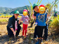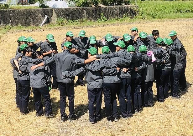 園児のみなさん 稲刈り上手でした 円陣!! 午後からも大成功させるぞー