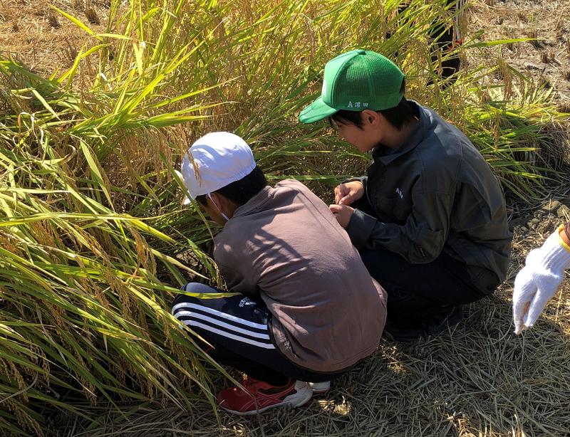 農業科1年生「農業と環境」の授業で、稲刈り交流学習を行いました。