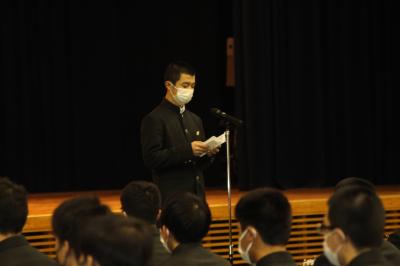 在校生総代として、生徒会長の濵田くんが送辞を述べました。在校生の代表として、各学科の先輩方が日夜努力してこられた姿に、在校生のみんなが感謝と尊敬と感銘を受けたことが述べられました。また、卒業生の希望ある飛翔を願うメッセージを向けられました。